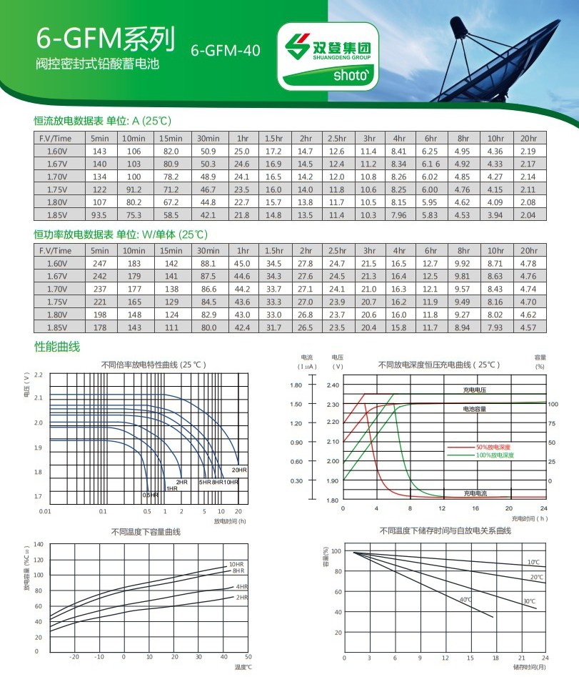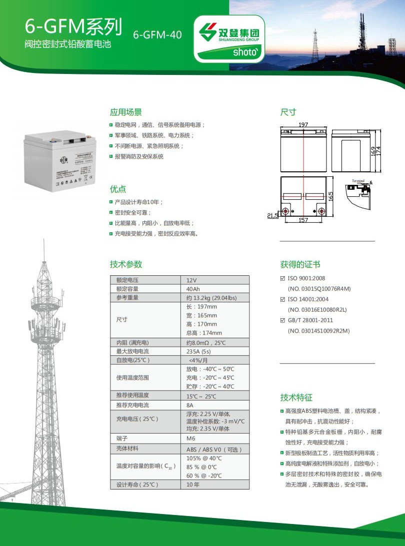 应用场景稳定电网、通信、信号系统备用电源; 军事领域、电力系统、铁路系统备用电源; UPS备用电源,应急照明; 报警消防及安保系统。 优点产品设计寿命10年; 密封安全可靠; 比能量高,内阻小,自放电率低; 充电接受能力强,密封反应效率高。 技术特征高强度ABS塑料电池槽、盖,结构紧凑,具有耐冲击,抗震动性能好; 特种铅基多元合金板栅,内阻小,耐腐蚀性好,充电接受能力强; 新型极板制造工艺,活性物质利用率高; 高纯度电解液和特殊添加剂,自放电小; 多层密封技术和特殊的密封胶,确保电池无泄漏,无酸雾逸出,安全可靠。 获得的证书ISO 9001:2008 (NO.03015Q10076R4M) ISO 14001:2004 (NO.03016E10080R2L) GB/T 28001-2011 (NO.03014S10092R2M)