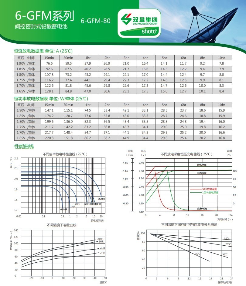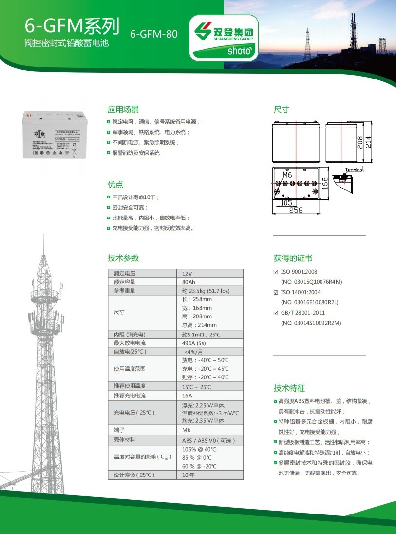应用场景稳定电网、通信、信号系统备用电源; 军事领域、电力系统、铁路系统备用电源; UPS备用电源,应急照明; 报警消防及安保系统。 优点产品设计寿命10年; 密封安全可靠; 比能量高,内阻小,自放电率低; 充电接受能力强,密封反应效率高。 技术特征高强度ABS塑料电池槽、盖,结构紧凑,具有耐冲击,抗震动性能好; 特种铅基多元合金板栅,内阻小,耐腐蚀性好,充电接受能力强; 新型极板制造工艺,活性物质利用率高; 高纯度电解液和特殊添加剂,自放电小; 多层密封技术和特殊的密封胶,确保电池无泄漏,无酸雾逸出,安全可靠。 获得的证书ISO 9001:2008 (NO.03015Q10076R4M) ISO 14001:2004 (NO.03016E10080R2L) GB/T 28001-2011 (NO.03014S10092R2M)