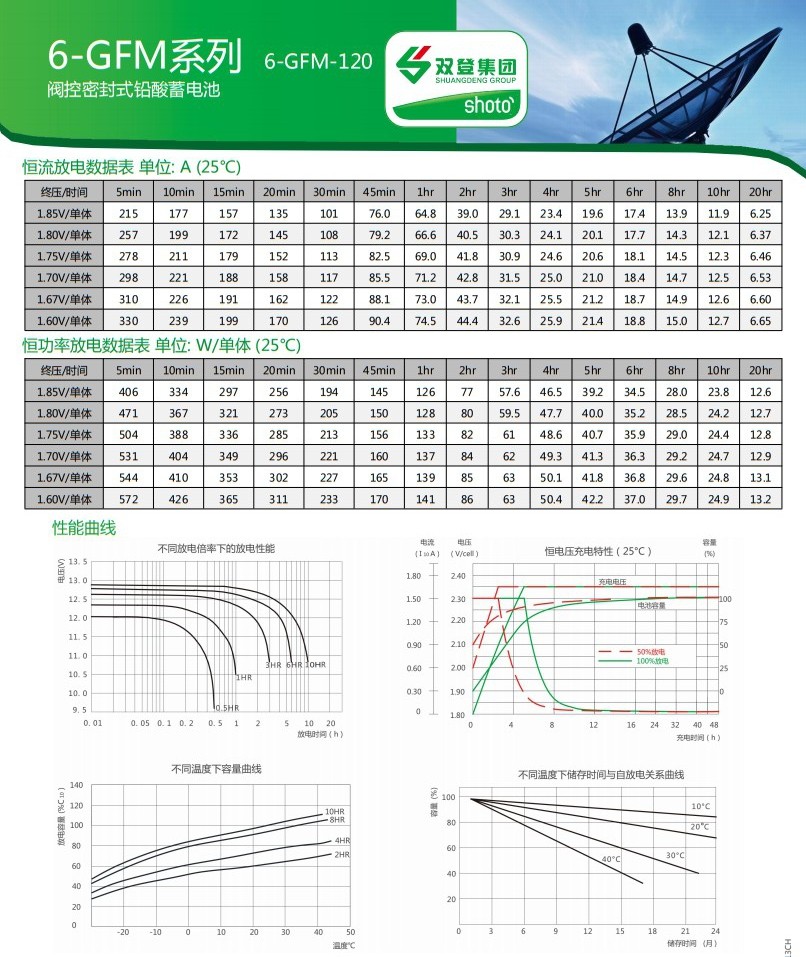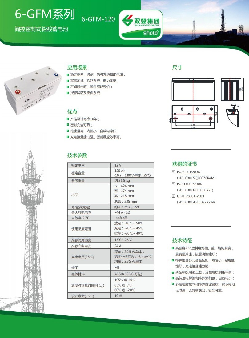 应用场景稳定电网、通信、信号系统备用电源; 军事领域、电力系统、铁路系统备用电源; UPS备用电源,应急照明; 报警消防及安保系统。 优点产品设计寿命10年; 密封安全可靠; 比能量高,内阻小,自放电率低; 充电接受能力强,密封反应效率高。 技术特征高强度ABS塑料电池槽、盖,结构紧凑,具有耐冲击,抗震动性能好; 特种铅基多元合金板栅,内阻小,耐腐蚀性好,充电接受能力强; 新型极板制造工艺,活性物质利用率高; 高纯度电解液和特殊添加剂,自放电小; 多层密封技术和特殊的密封胶,确保电池无泄漏,无酸雾逸出,安全可靠。 获得的证书ISO 9001:2008 (NO.03015Q10076R4M) ISO 14001:2004 (NO.03016E10080R2L) GB/T 28001-2011 (NO.03014S10092R2M)