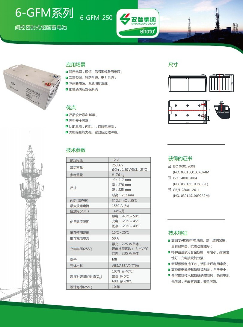 应用场景稳定电网、通信、信号系统备用电源; 军事领域、电力系统、铁路系统备用电源; UPS备用电源,应急照明; 报警消防及安保系统。 优点产品设计寿命10年; 密封安全可靠; 比能量高,内阻小,自放电率低; 充电接受能力强,密封反应效率高。 技术特征高强度ABS塑料电池槽、盖,结构紧凑,具有耐冲击,抗震动性能好; 特种铅基多元合金板栅,内阻小,耐腐蚀性好,充电接受能力强; 新型极板制造工艺,活性物质利用率高; 高纯度电解液和特殊添加剂,自放电小; 多层密封技术和特殊的密封胶,确保电池无泄漏,无酸雾逸出,安全可靠。 获得的证书ISO 9001:2008 (NO.03015Q10076R4M) ISO 14001:2004 (NO.03016E10080R2L) GB/T 28001-2011 (NO.03014S10092R2M)