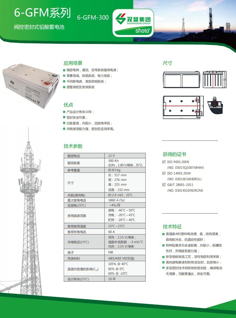 应用场景稳定电网、通信、信号系统备用电源; 军事领域、电力系统、铁路系统备用电源; UPS备用电源,应急照明; 报警消防及安保系统。 优点产品设计寿命10年; 密封安全可靠; 比能量高,内阻小,自放电率低; 充电接受能力强,密封反应效率高。 技术特征高强度ABS塑料电池槽、盖,结构紧凑,具有耐冲击,抗震动性能好; 特种铅基多元合金板栅,内阻小,耐腐蚀性好,充电接受能力强; 新型极板制造工艺,活性物质利用率高; 高纯度电解液和特殊添加剂,自放电小; 多层密封技术和特殊的密封胶,确保电池无泄漏,无酸雾逸出,安全可靠。 获得的证书ISO 9001:2008 (NO.03015Q10076R4M) ISO 14001:2004 (NO.03016E10080R2L) GB/T 28001-2011 (NO.03014S10092R2M)